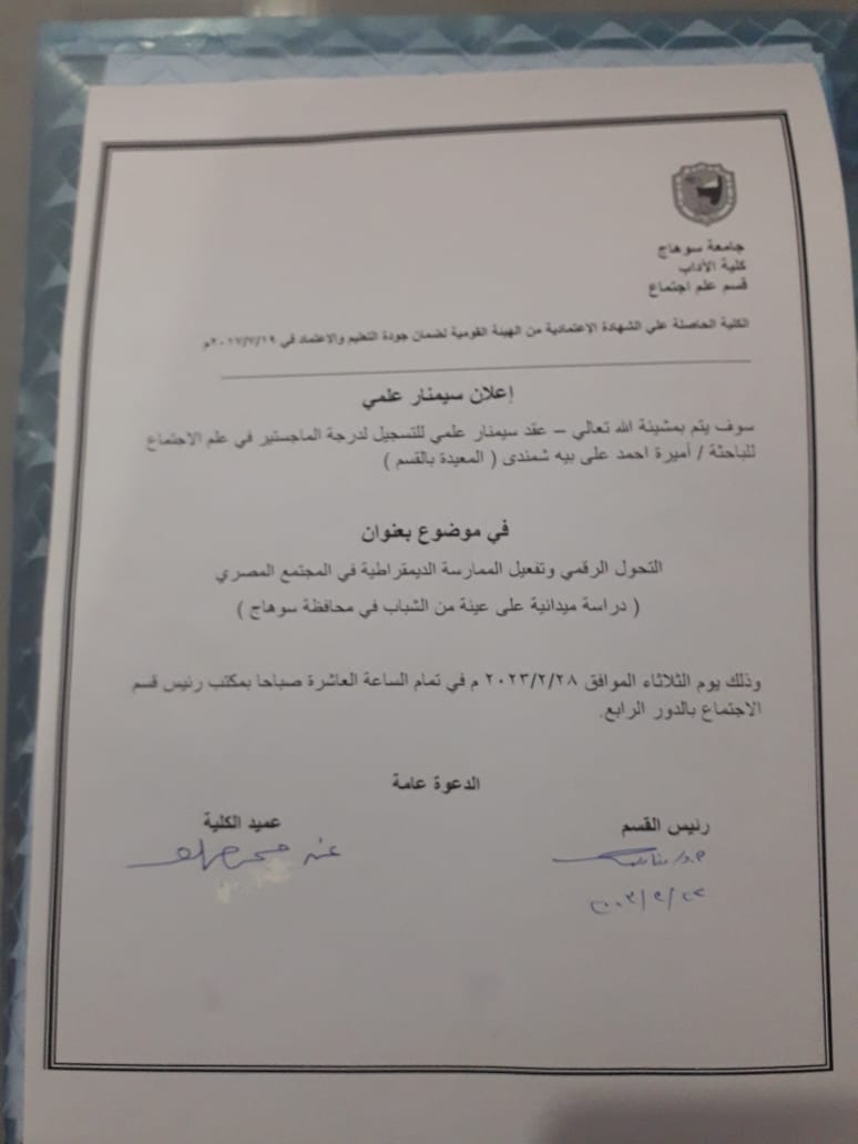وسعادة الاستاذة الدكتورة / وفاء محمد علي رئيسة قسم الاجتماع فإنه سوف يتم بمشيئة الله تعالى – عقد سيمنار علمي للتسجيل لدرجة الماجستير في علم الاجتماع للباحثة / أميرة احمد على بيه شمندى ( المعيدة بالقسم )