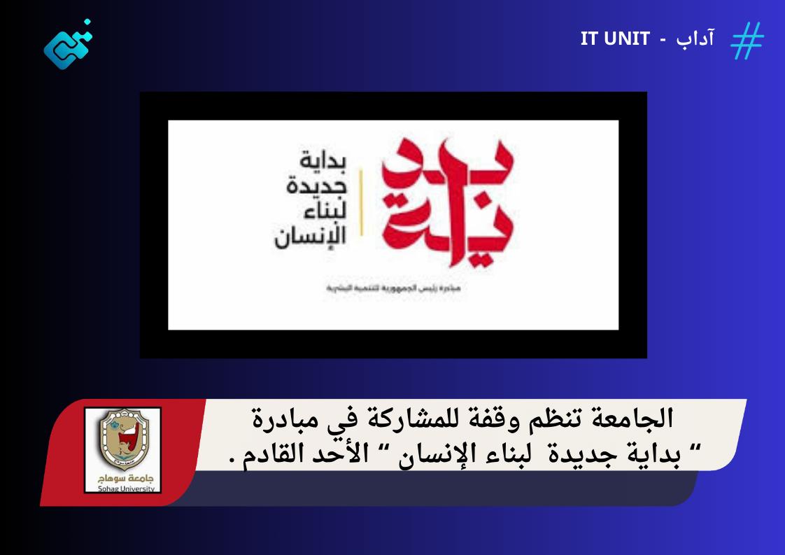 بتوجيهات من الدكتور حسان نعمان رئيس الجامعة ، والمحاسب أشوف القاضي أمين عام الجامعة ؛ تنظم جامعة سوهاج وقفة للمشاركة في مبادرة التنمية البشرية ” بداية جديدة لبناء الإنسان ” التي أطلقها الرئيس عبد الفتاح السيسي ، وذلك في تمام الساعة الثامنة من صباح يوم الأحد القادم الموافق ٢٢ سبتمبر ٢٠٢٤ ، أمام مبني الإدارة المركزية بمقر الجامعة القديم بحي شرق .