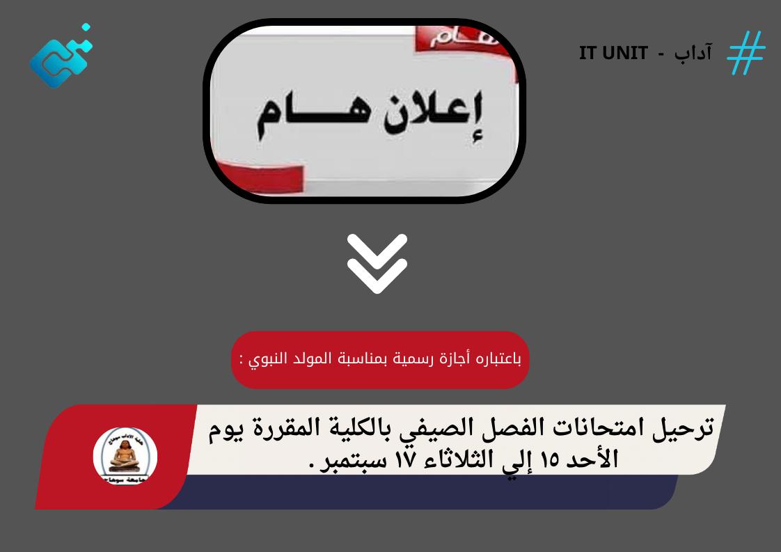 باعتباره أجازة رسمية بمناسبة المولد النبوي :ترحيل امتحانات الفصل الصيفي بالكلية المقررة يوم الأحد ١٥ إلي يوم الثلاثاء ١٧ سبتمبر .