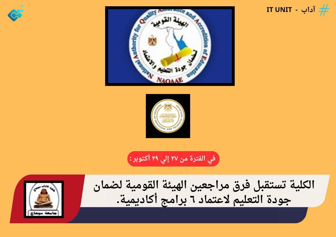 في الفترة من ٢٧ إلي ٢٩ أكتوبر : الكلية تستقبل فرق مراجعين الهيئة القومية لضمان جودة التعليم لاعتماد ٦ برامج أكاديمية .