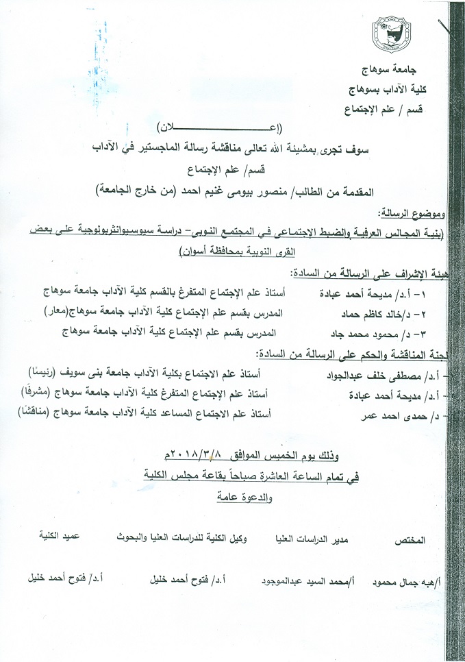 سوف يتم بمشيئة الله تعالي مناقشة رسالة مناقشة رسالة الماجستير قسم علم الاجتماع المقدمة من الطالب / منصور بيومي غنيم احمد (من خارج الجامعة) تحت عنوان ( بنية المجالس العرفية والضبط الاجتماعي في المجتمع النوبي – دراسة سيوسيوانثربولوجية علي بعض القري النوبية بمحافظة أسوان) وذلك يوم الخميس الموافق 8/3/2018 في تمام الساعة العاشرة صباحا بقاعة مجلس الكلية