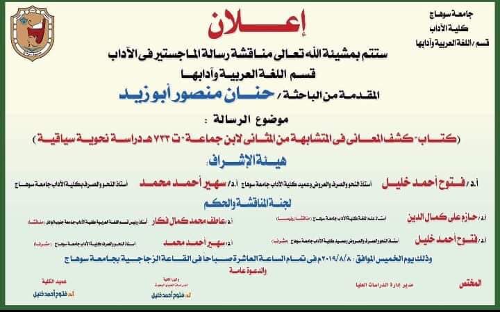 سوف يتم بمشيئة الله تعالي مناقشة رسالة مناقشة رسالة الماجستير قسم اللغة العربية وآدابها المقدمة من الطالبة / حنان منصور ابو زيد تحت عنوان (كتاب كشف المعاني في المتشابهة من المثاني لابن جماعة ت 733هـ دراسة نحوية سياقية ) وذلك يوم الخميس الموافق 8/8/2018 في تمام الساعة العاشرة صباحاً بالقاعة الزجاجية بجامعة سوهاج