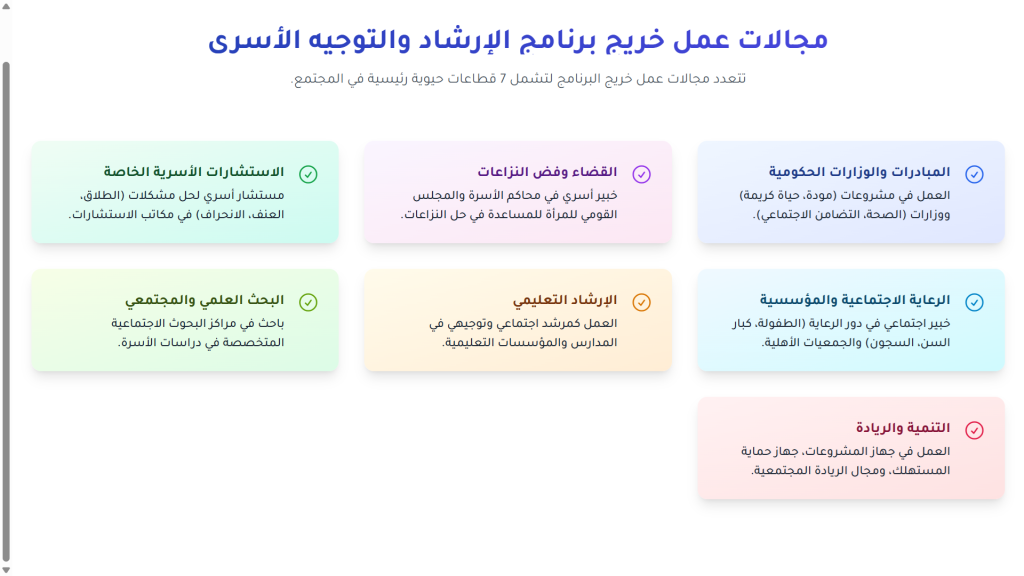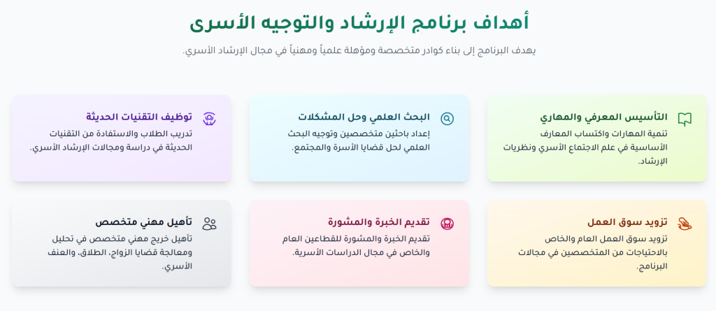 وأضاف أن البرنامج يهدف بشكل أساسي إلى تخريج كوادر متميزة من المرشدين الأسريين، بعد إعدادهم إعداداً مهنياً وأكاديمياً، بما يسهم في خدمة المجتمع في مجال الإرشاد والتوجيه الأسري الذي يعد من أهم القضايا المجتمعية.