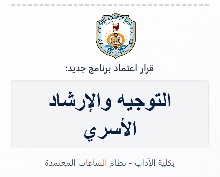 أصدر سعادة الأستاذ الدكتور أ.د محمد أيمن عاشور، وزير التعليم العالي والبحث العلمي ورئيس المجلس الأعلى للجامعات، قراراً وزارياً برقم (2350) وتاريخ 21 أكتوبر ٢٠٢٥، يقضي بتعديل اللائحة الداخلية لمرحلة الليسانس بنظام الساعات المعتمدة بكلية الآداب بجامعة سوهاج، وذلك بإضافة برنامج “الليسانس في الآداب تخصص (التوجيه والإرشاد الأسري)”.