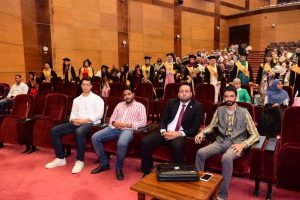 ومن جانبه هنأ الدكتور محمود مراد الطلاب بمناسبة بخرجهم والإنتهاء من مشوارهم التعليمي، داعياً الطلاب الاستعداد لخوض تجاربالحياة العملية متسلحين بالعلم، والانطلاق لسوق العمل بأحدث الأساليب العملية الحديثة في مجال الترجمة الفورية، والإستمرار فيالتحصيل العلمي وأن لا يكون تخرجهم هذا إلا دافعاً لهم لينطلقوا الى مستويات أعلى في العلم، متمنياً لهم مزيد من النجاح و التوفيق .
