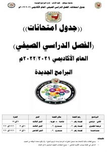 اعلن الاستاذ الدكتور محمود مراد وكيل كلية الآداب لشؤون التعليم والطلاب، وبرعاية الاستاذ الدكتور كريم مصلح صالح عميد الكلية، عن جداول امتحانات الفصل الدراسي الصيفى للبرامج الجديدة للعام الجامعي 2021/2022، والمقرر ابتداءها الاحد الموافق 18/9/2022 وتنتهي الخميس الموافق 22/9/2022، مشير ان اللجان تبدا من الساعة التاسعة صباحا حتي الساعة الثانية عشر ظهرا، لافتا بأن دخول الامتحان ببطاقة تحقيق الشخصية، وتسديد الرسوم قبل الامتحان ومحددا موقفه من التجنيد، مع مراعاة كافة الاجراءات الاحترازية للوقاية من فيروس كورونا .