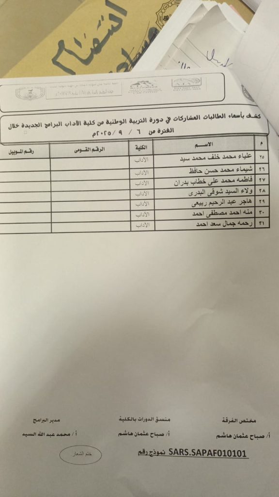 على الطالبات ممن لم يسجلن نهائيًا في أيًا من دورات التربية الوطنية ولم يقمن بتسليم صورة الرقم القومي والكارنيه لمسئول الفرقة الأولى (الأقسام)، سرعة التسجيل بشئون الطلاب.