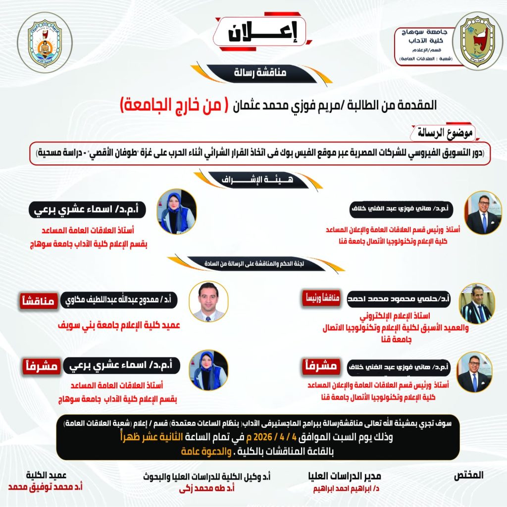 أعلنت كلية الآداب بجامعة سوهاج، عن تحديد موعد مناقشة رسالة الماجستير المقدمة من الباحثة مريم فوزي محمد عثمان (من خارج الجامعة)، والمقيدة بقسم الإعلام “شعبة العلاقات العامة” بنظام الساعات المعتمدة، وذلك في تمام الساعة الثانية عشرة ظهر يوم السبت الموافق 4 أبريل 2026 بالقاعة المخصصة للمناقشات بالكلية، حيث تأتي هذه المناقشة في إطار الحراك العلمي والبحثي الذي تشهده الكلية لتعزيز دور الدراسات العليا في معالجة القضايا المعاصرة.