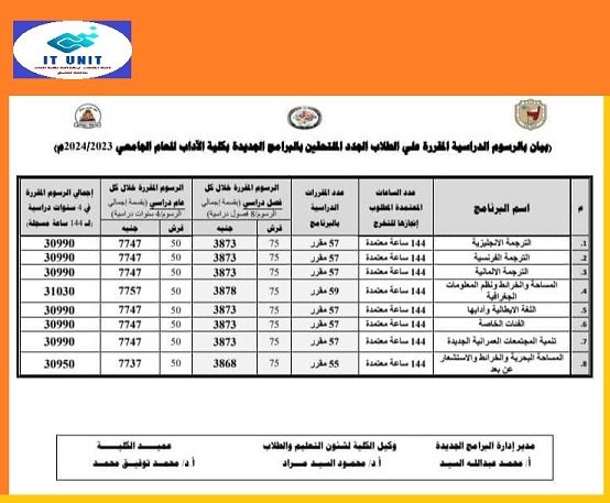 اعتمدت كلية الآداب الرسوم الدراسية المقررة على الطلاب الجدد الملتحقين بالبرامج الثمانية الجديدة بالكلية ، وذلك خلال العام الجامعي 2023/ 2024 . وحددت الكلية الرسوم المقررة بالنسبة لكل فصل دراسي ( بقسمة إجمالي الرسوم على 8 فصول دراسية ) ، وخلال عام دراسي ( بقسمة إجمالي الرسوم على 4 سنوات دراسية )، ثم إجمالي الرسوم المقررة في 4 سنوات دراسية ( متعلقة بدراسة 144 ساعة معتمدة مطلوب إنجازها للتخرج ) .