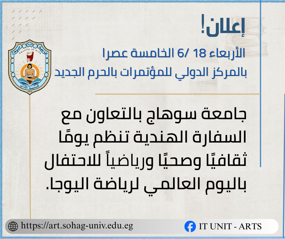 تحت رعاية السيد الأستاذ الدكتور حسان النعماني، رئيس جامعة سوهاج، وبحضور وتشريف سعادة السفير سوريش ريدي، سفير جمهورية الهند بالقاهرة، تنظم الجامعة فعاليات “اليوم العالمي لليوجا”، وذلك يوم الأربعاء الموافق 18 من شهر يونيو الجاري، في رحاب المركز الدولي للمؤتمرات بالحرم الجامعي الجديد. وتأتي هذه الفعالية ترسيخًا للروابط الثقافية والعلمية بين مصر والهند، وتأكيدًا على حرص الجامعة على الانفتاح على الثقافات العالمية المختلفة.