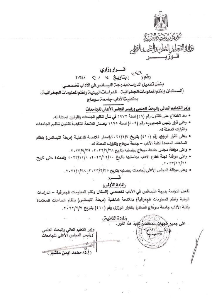 أصدر الدكتور محمد أيمن عاشور – وزير الدولة للتعليم العالي والبحث العلمي ورئيس المجلس الأعلى للجامعات – القرار رقم (246) بتاريخ 7 فبراير 2024 ، بشأن تفعيل الدراسة بدرجة الليسانس في الآداب تخصصي ( السكان ونظم المعلومات الجغرافية – الدراسات البيئية ونظم المعلومات الجغرافية ) بقسم الجغرافيا ونظم المعلومات الجغرافية بكلية الآداب جامعة سوهاج ، باللائحة الداخلية ( مرحلة الليسانس ) ، وذلك بنظام الساعات المعتمدة .
