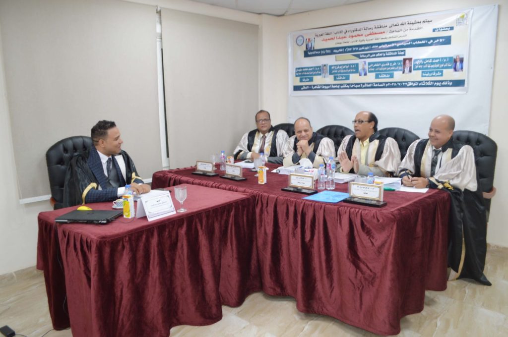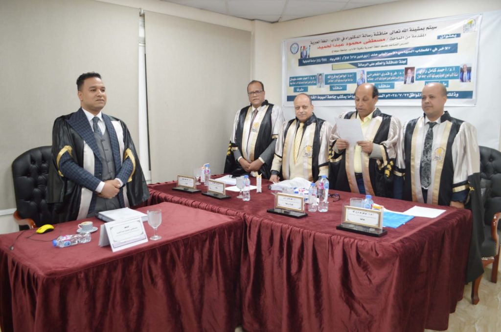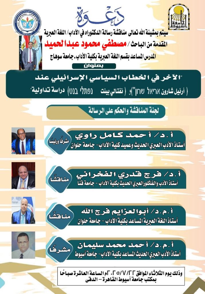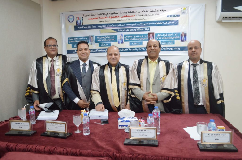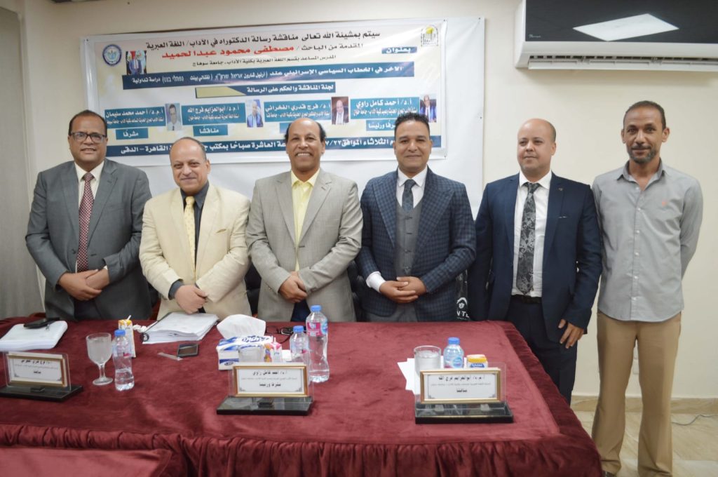 حصل الباحث مصطفى محمود عبد الحميد، المدرس المساعد بقسم اللغات الشرقية “اللغة العبرية” بكلية الآداب بجامعة سوهاج، على درجة الدكتوراه في الآداب بمرتبة الشرف الأولى. حيث جاءت رسالة الباحث تحت عنوان “الآخر في الخطاب السياسي الإسرائيلي عند (أرئيل شارون) و(نفتالي بينت): دراسة تداولية”.