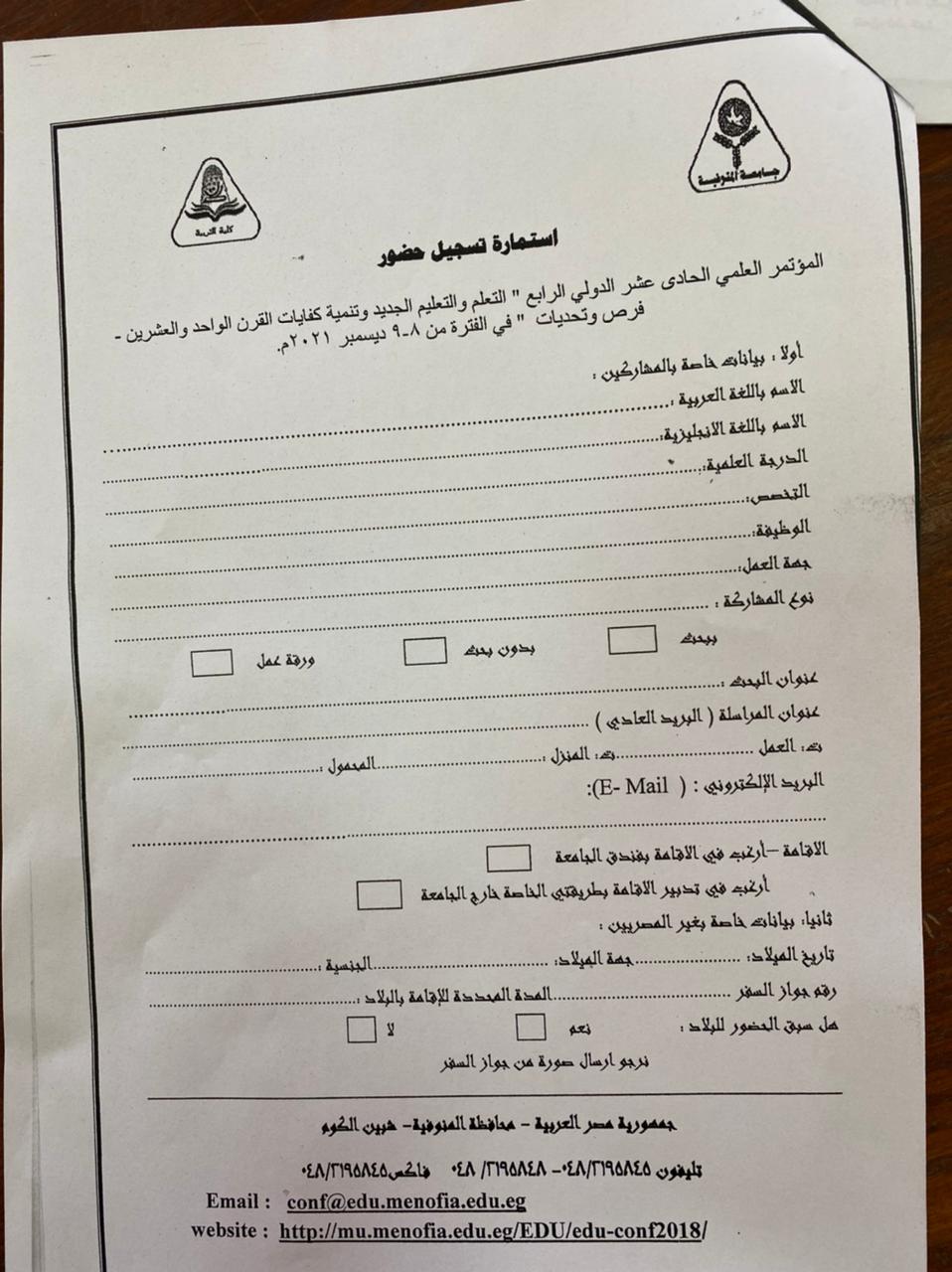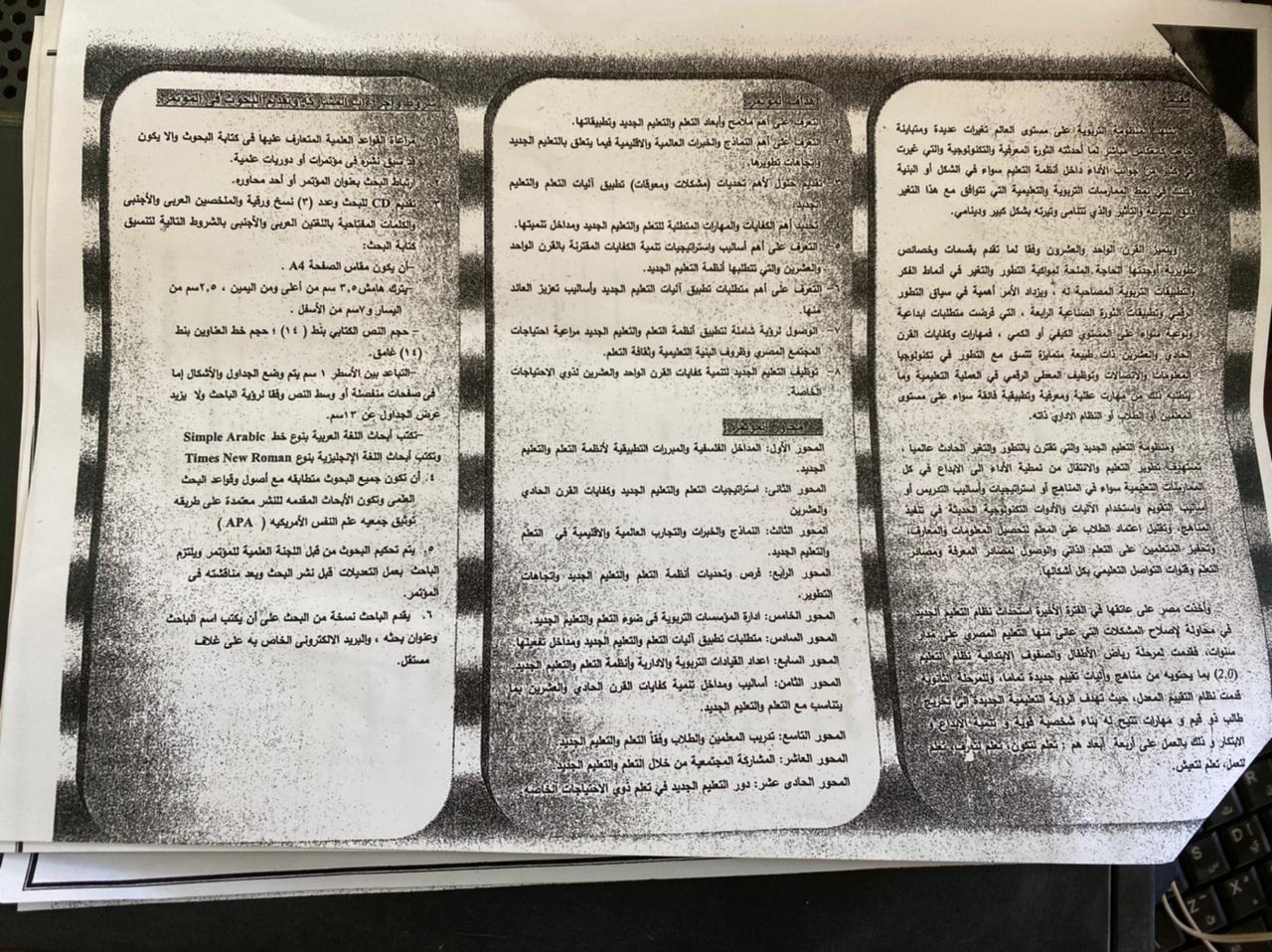 وفي الختام أفاد “مصلح” الشروط الواجب توافرها في حالة تقديم بحوث للمؤتمر وتتلخص في مراعاة القواعد العلمية المتعارف عليها في كتابة البحوث وألا يكون قد سبق نشره في مؤتمرات او دوريات علمية ، ويكون البحث له صلة وثيقة بعنوان المؤتمر ، وتقديم اسطوانة للبحث وعدد ٣ نسخ ورقية والملخصين العربي والأجنبي والكلمات المفتاحية باللغتين العربي والأجنبي ، وتكون جيمع البحوث متطابقة مع أصول وقواعد البحث العلمي ومعتمده علي طريقة توثيق جمعية علم النفس الامريكية (APA) ، وتقدم الباحث نسخة من البحث علي ان يكتب اسمه وعنوان بحثه ، والبريد الالكتروني الخاص به علي غلاف مستقل.