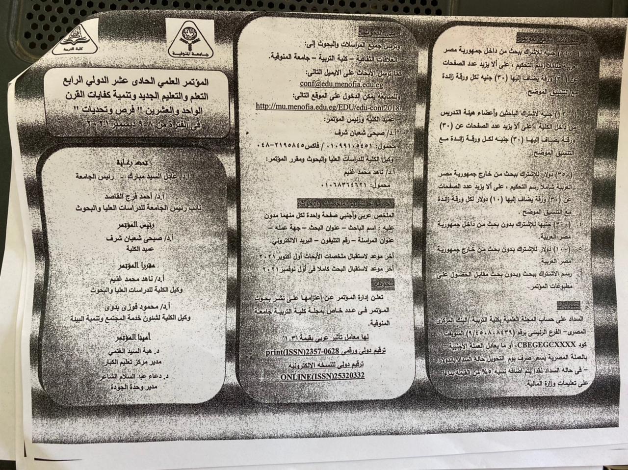 استقبل الاستاذ الدكتور كريم مصلح صالح عميد كلية الآداب دعوه من كلية التربيةجامعة المنوفية بشبين الكوم ، لحضور المؤتمر العلمى الحادي عشر الدولي الرابع ، وذلك بعنوان ” التعلم والتعليم الجديد وتنمية كفايات القرن الواحد والعشرين – فرص وتحديات ” والمنعقد في الفتره من ٨-٩ ديسمبر ٢٠٢١ بمشاركة اعضاء هيئة التدريس والهيئة المعاونة.