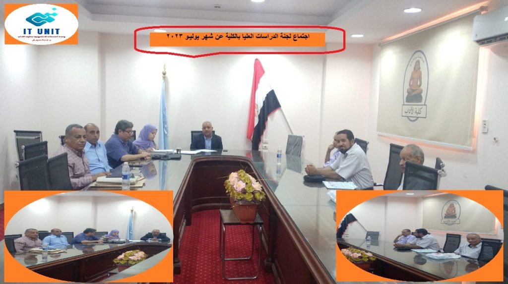 عقدت لجنة الدراسات العليا بكلية الآداب – برئاسة الدكتور محمد توفيق عميد الكلية – جلستها الدورية صباح يوم الاثنين الموافق ١٠ يوليو٢٠٢٣ ، وبحضور كل من : الدكتور فتوح أحمد خليل الأستاذ المتفرغ بقسم اللغة العربية ومنسق برنامج اللغة العربية لغير الناطقين بها ، والدكتور محمد علي سلامة الأستاذ المتفرغ بقسم الاجتماع ، والدكتور إسماعيل فهمي الأستاذ بقسم الدراسات الإسلامية ، والدكتور شعبان عبد الله محمد الأستاذ ورئيس قسم الفلسفة ، والدكتور محمود حجاب الأستاذ بقسم الجغرافيا ومنسق برنامج المساحة والخرائط ونظم المعلومات الجغرافية ، والدكتور بهاء محمد عثمان الأستاذ بقسم اللغة العربية ، وهبة جمال مديرة إدارة الدراسات العليا والبحوث .