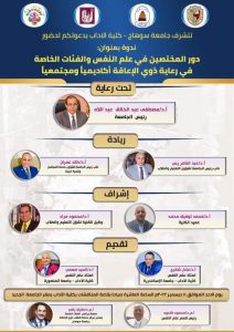 الندوة من فعاليات وتقديم وإشراف السيد الدكتور ” محمود عبدالعزيز قاعود ” رئيس قسم علم النفس، والسيد الدكتور “طارق زكي موسي ” منسق برنامج الفئات الخاصة ، ومدير مركز خدمة الطلاب ذوي الإعاقة بجامعة سوهاج …