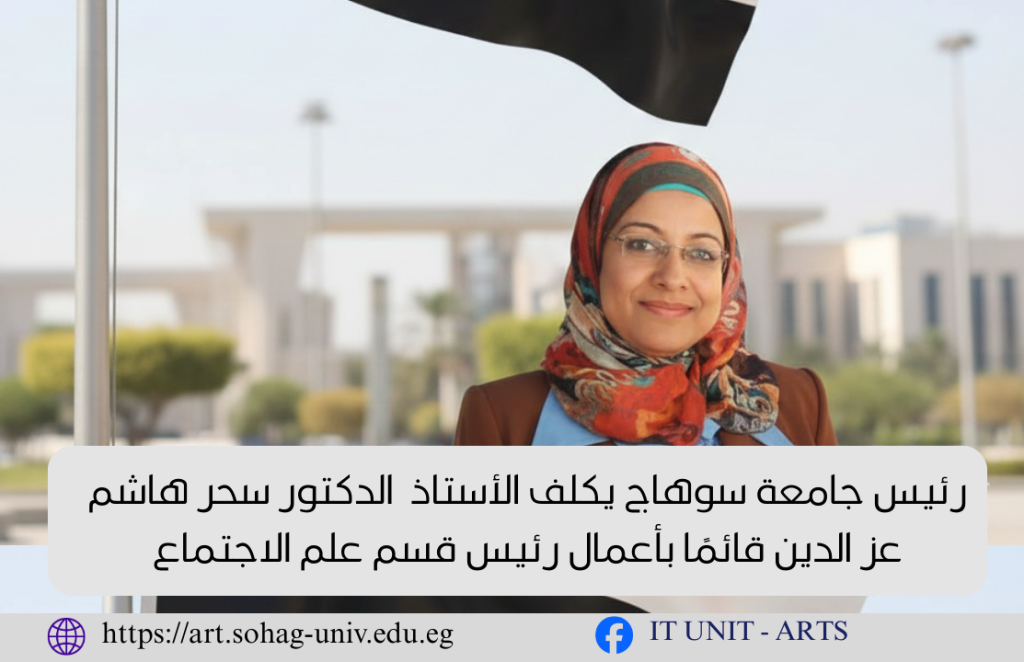 أصدر معالي الأستاذ الدكتور حسان النعماني، رئيس جامعة سوهاج، بناءً على الخطاب المقدم من سعادة الأستاذ الدكتور محمد توفيق، عميد كلية الآداب، قرارًا بتكليف السيدة الأستاذة الدكتورة/ سحر هاشم عز الدين، الأستاذ المساعد بقسم علم الاجتماع، قائمًا بأعمال رئيس قسم علم الاجتماع بكلية الآداب، وذلك لمدة عام.