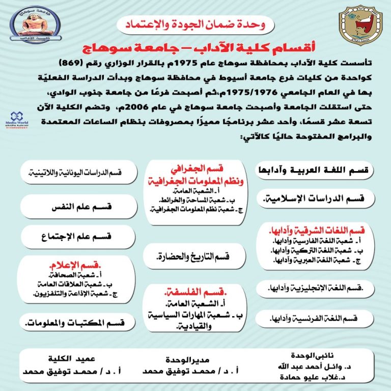 كما يشرفني ويسعدني أن أرحب بكم في هذا الصرح العلمي الذى نأمل أن يستمر فيه ذلك العمل الدؤوب والجاد منذ الإنشاء لتطبيق كل ما هو جديد ومتميز في المجال الاجتماعي والإنساني ، لدفع مسيرة كلية الآداب نحو مزيد من التطور والرقى في قطاعات التعليم والبحث العلمي وخدمة المجتمع وتنمية البيئة .