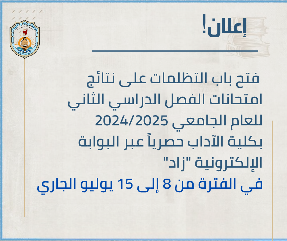 تحت رعاية الأستاذ الدكتور حسان النعماني، رئيس الجامعة الموقر، قررت إدارة كلية الآداب، بتوجيهات من عميد الكلية، فتح باب تلقي التظلمات المقدمة من الطلاب على نتيجة الفصل الدراسي الثاني للعام الجامعي 2024/2025. سيتم تلقي التظلمات إلكترونيًا عبر منصة “زاد”، بدءًا من يوم الثلاثاء الموافق 8 يوليو وحتى الثلاثاء 15 يوليو 2025.