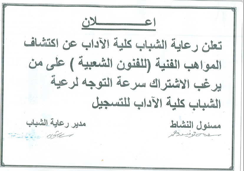تعلن رعاية الشباب كلية الآداب عن اكتشاف المواهب الفنية ( للفنون الشعبية ) علي من يرغب الاشتراك سرعة التوجه لرعاية الشباب كلية الآداب للتسجيل مسابقة اكتشاف المواهب الفنية ( للفنون الشعبية ) تصفّح المقالات جدول محاضرات برنامج ترجمة اللغة الأنجليزية لجميع الفرقمسابقة اكتشاف المواهب الفنية ( الغناء – الموسيقي )