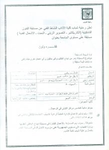 تعلن رعاية الشباب النشاط الفني عن مسابقة الفنون التشكيلية ( الكاريكاتير – التصوير الزيتي – النحت – الاشغال الفنية ) مسابقة علي مستوي الجامعة بعنوان فكره ولون شروط المسابقة موضوع المسابقة ( حر من ابداع الطالب وغير منقول ) مشابقة الفنون التشكيلية (النشاط الفني) تصفّح المقالات اللقاء الرياضي للأشخاص ذوي الاعاقة لطلبة وطالبات الجامعة المصريةمشروع مركز الفنون ( النشاط الثقافي)