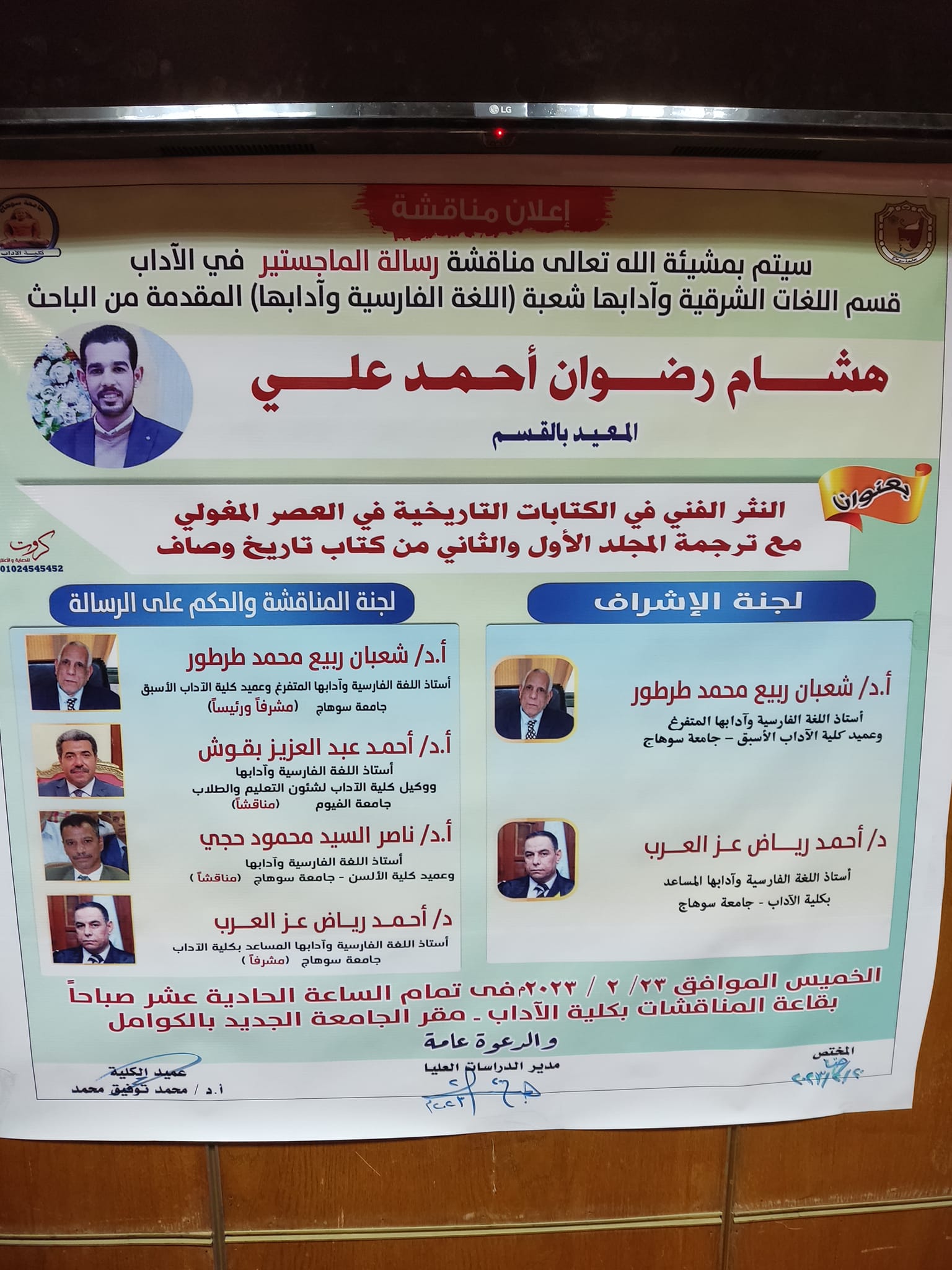 مناقشة رسالة الماجستير في الآداب قسم اللغات الشرقية وآدابها شعبة اللغة الفارسية وآدابها المقدمة من الباحث هشام رضوان أحـمـد المعيد بالقسم بعنوان ” النثر الفني في الكتابات التاريخية في العصر المغولي مع ترجمة المجلد الأول والثاني من كتاب تاريخ وصاف ”