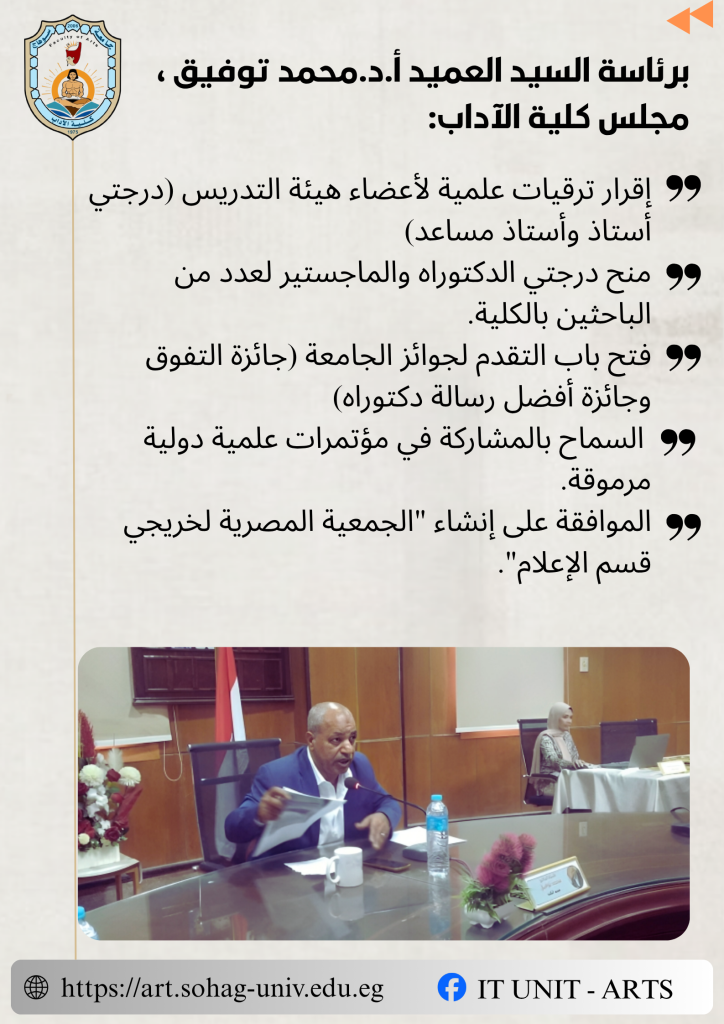 شهد مجلس كلية الآداب بجامعة سوهاج، برئاسة السيد العميد أ.د/ محمد توفيق عميد الكلية، في جلسته الدورية لشهر يونيو 2025، إقرار حزمة من القرارات الهامة التي تدعم أعضاء هيئة التدريس والباحثين، وتفتح آفاقًا جديدة للتواصل مع المجتمع الأكاديمي والدولي.