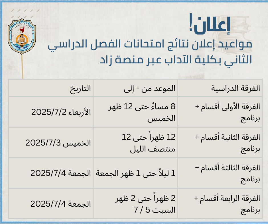 وافق السيد الأستاذ الدكتور عميد الكلية على جدول إعلان نتائج امتحانات الفصل الدراسي الثاني للعام الجامعي 2025/2024، وذلك بناءً على الاقتراح المقدم بهدف تحقيق المرونة وتجنب المشاكل الفنية التي قد تعيق عملية إعلان النتائج على المنصة الإلكترونية. وقد صدر هذا الجدول بعد موافقة السيد وكيل الكلية لشؤون التعليم والطلاب الأستاذ الدكتور/ محمود السيد مراد.