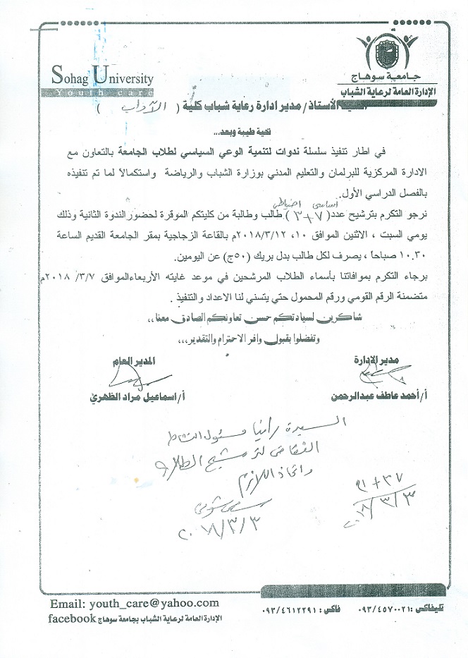 في اطار تنفيذ سلسلة ندوات لتنمية الوعي السياسي لطلاب الجامعة بالتعاون مع الادراة المركزية للبرلمان والتعليم المدني بوزارة الشباب والرياضة واستكمالا لما تم تنفيذه بالفصل الدراسي الاول ندوة لتنمية الوعي السياسي لطلاب الجامعة تصفّح المقالات “الفلسفة والتسامح ” ندوة لسفارة المعرفة بجامعة سوهاجمناقشة رسالة الماجستير قسم علم الاجتماع