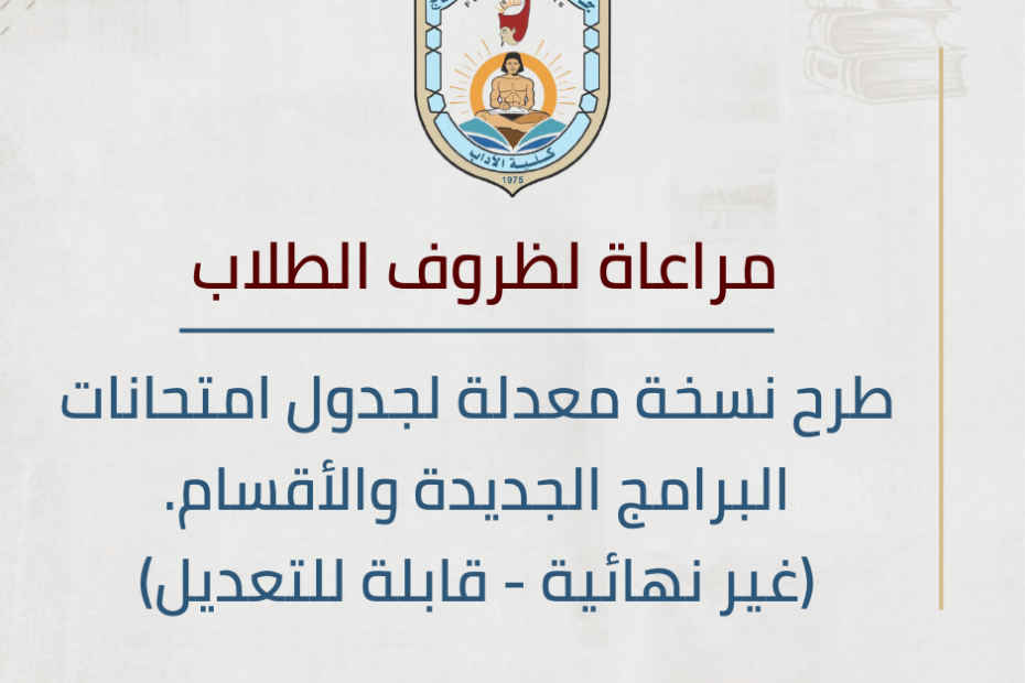 أعلن السيد الأستاذ الدكتور أ.د. محمد توفيق، عميد كلية الآداب، عن طرح نسخة معدلة من جدول امتحانات (غير نهاية) للفصل الدراسي الأول الخاص بطلاب الأقسام البرامج الجديدة، وذلك في إطار الحرص المستمر لإدارة الكلية على مصلحة الطلاب ومراعاة ظروفهم، وسعياً لتوفير الأجواء الملائمة التي تساعدهم… اقرأ المزيد »“آداب سوهاج”: الباب مفتوح لتعديل الجدول المعدل حتى 8 ديسمبر.