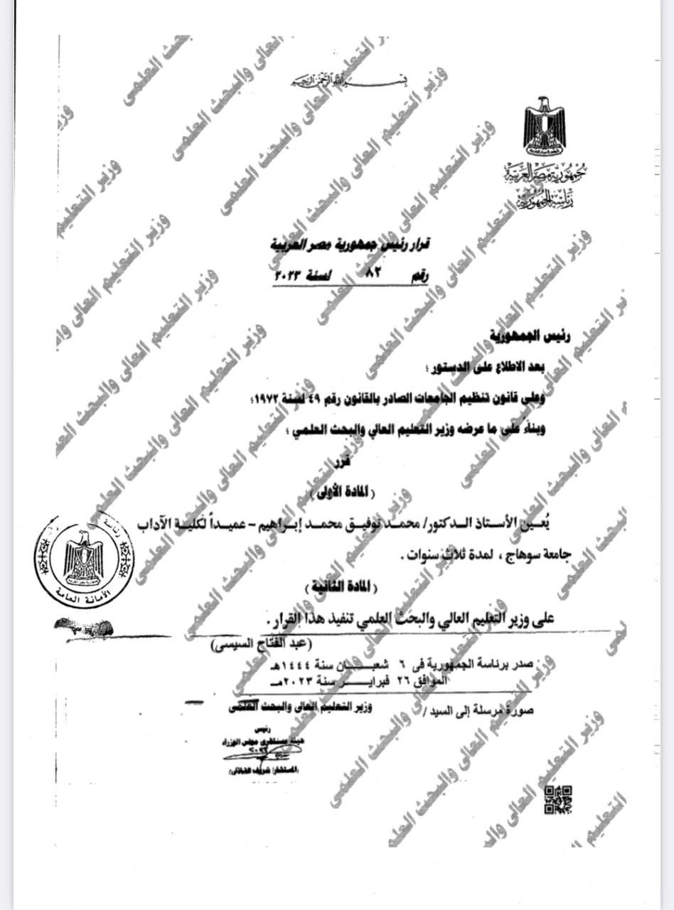 « قرار جمهوري من فخامة الرئيس “عبد الفتاح السيسي ” رقم (٨٢) لسنة ٢٠٢٣م ، بتعيين سعادة الأستاذ الدكتور “محمد توفيق محمد ابراهيم ” عميدا لكلية الآداب بسوهاج ***