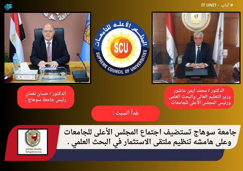 خلال اجتماعه الدوري بجامعة سوهاج : – المجلس الأعلى للجامعات يوافق على إطلاق مسابقة ” أفضل جامعة للأنشطة الطلابية ” للعام الجامعي 2024/2025. – الدكتور محمد أيمن عاشور يفتتح مشروعات تعليمية وصحية وملتقى ” الاستثمار في البحث العلمي ” بالجامعة . – وزير التعليم العالي… اقرأ المزيد »المجلس الأعلى للجامعات يوافق على إطلاق مسابقة ” أفضل جامعة للأنشطة الطلابية ” للعام الجامعي 2024/2025.