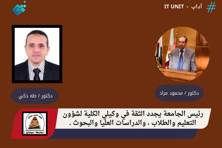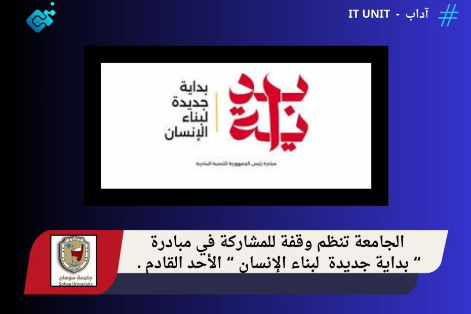 بتوجيهات من الدكتور حسان نعمان رئيس الجامعة ، والمحاسب أشوف القاضي أمين عام الجامعة ؛ تنظم جامعة سوهاج وقفة للمشاركة في مبادرة التنمية البشرية ” بداية جديدة لبناء الإنسان ” التي أطلقها الرئيس عبد الفتاح السيسي ، وذلك في تمام الساعة الثامنة من صباح يوم… اقرأ المزيد »الجامعة تنظم وقفة للمشاركة في مبادرة ” بداية جديدة لبناء الإنسان ” الأحد القادم .