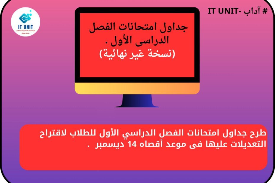 طرح جداول امتحانات الفصل الدراسي الأول للطلاب لاقتراح التعديلات عليها فى موعد أقصاه 14 ديسمبر .