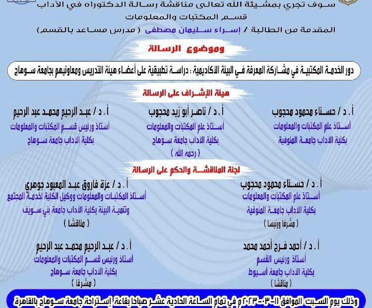 إعلان ( مهم ) دعوة للحضور والمشاركة مناقشة رسالة الدكتوراه في الآداب – قسم المكتبات والمعلومات